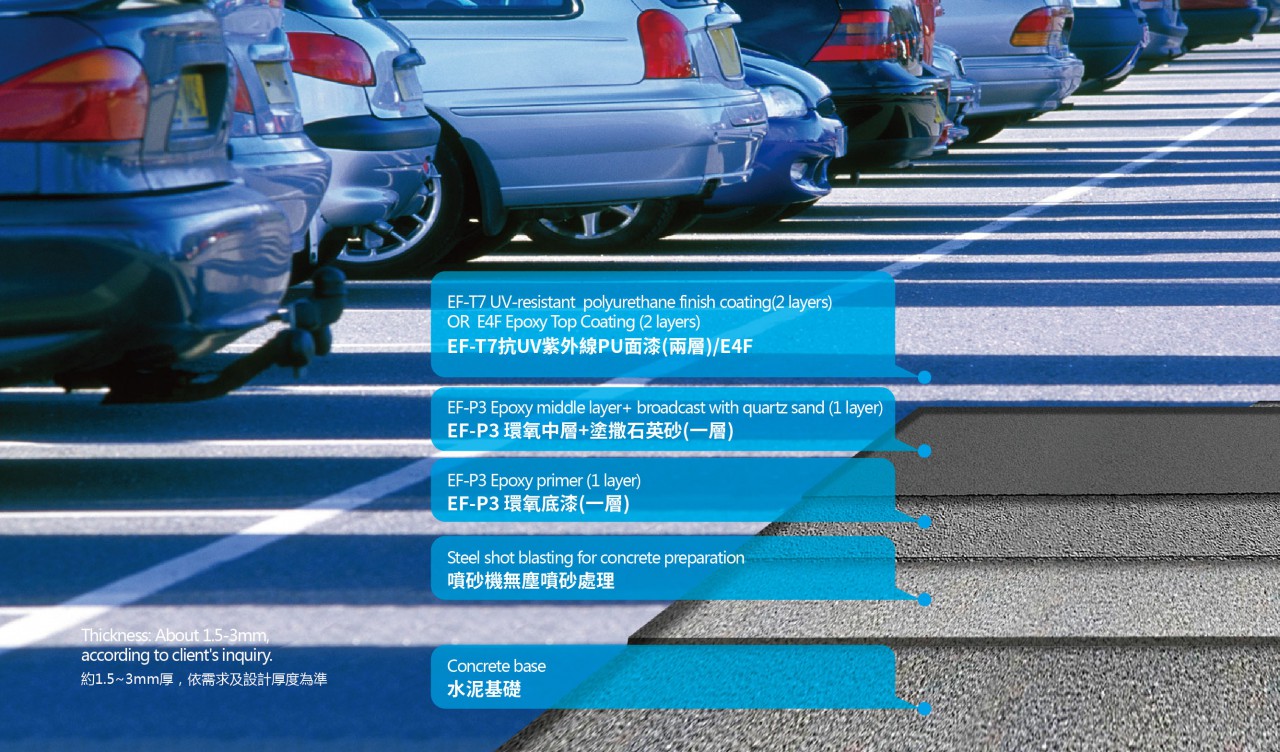 托柏斯RP聚氨酯面塗止滑耐磨停車場(chǎng)地坪系統(tǒng),此系統(tǒng)表面防滑,具有良好的抗UV性能及耐磨性能。適用於車流大的停車場(chǎng),如樓頂頂層及平面或室外停車場(chǎng)。