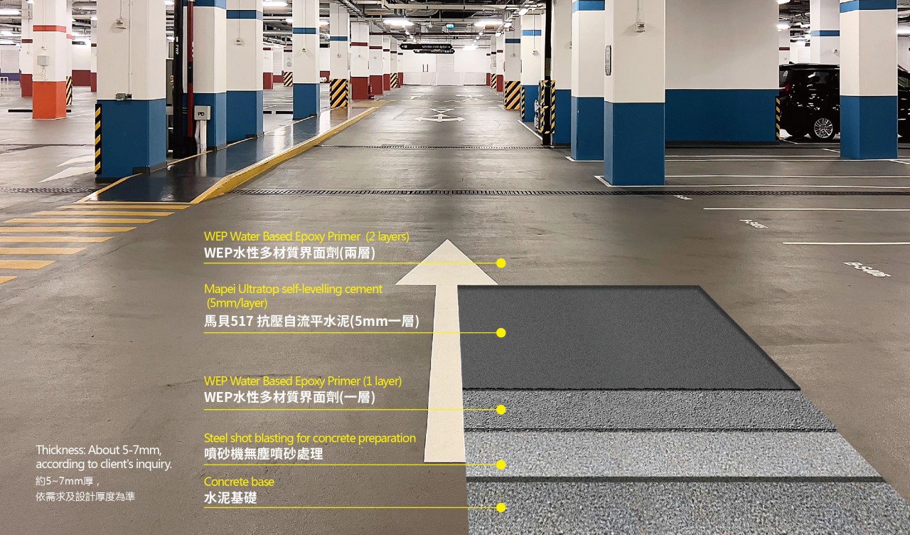 托柏斯BS水泥基抗潮氣系統(tǒng),是採用多層無縫環(huán)氧樹脂系統(tǒng),地基鋪設自流平水泥,對基面有一定的整找平作用,同時配合抗潮底漆使用,可在濕度較高的地基表面施工,適用於停車場的底層。