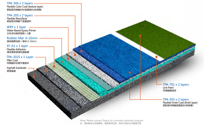 是由環(huán)保EPDM顆?;旌檄h(huán)保聚氨酯黏合劑製成的高彈型地墊作為緩衝層,並以水性柔韌質(zhì)丙烯酸樹(shù)脂配以精選填充料製成的100%純丙烯酸運(yùn)動(dòng)場(chǎng)地面層。適用於室內(nèi)外需要高耐磨的專業(yè)球場(chǎng),能抵禦紫外線及各種天氣條件等。