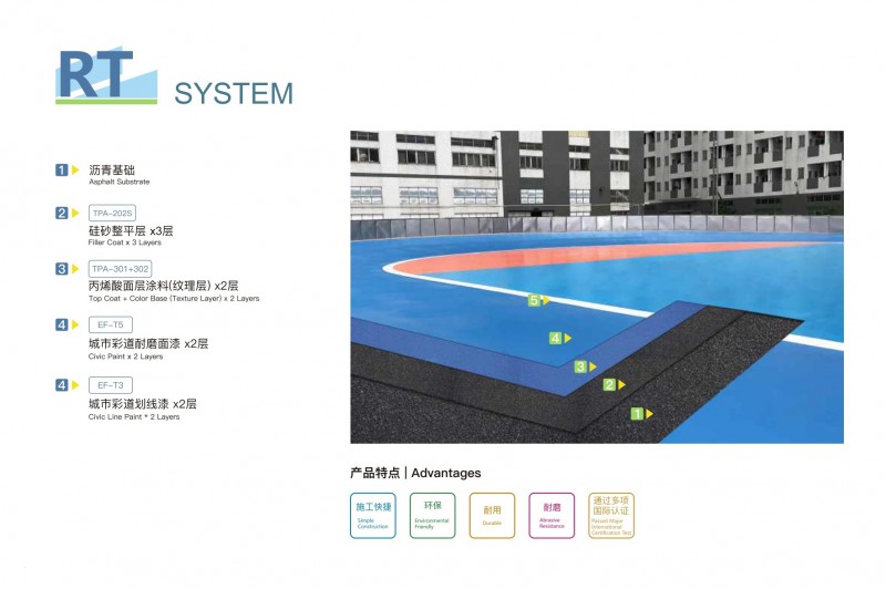 RT 輪滑道/自行車道系統(tǒng)主要考慮為在直排輪滑高強度踩踏地面使用下,場地必須擁有良好的抗衝擊性。直排輪、自行車高速滑動下,場地必須有高度的耐磨性。以及因多數(shù)場地建在戶外,故須有良好的耐候性。